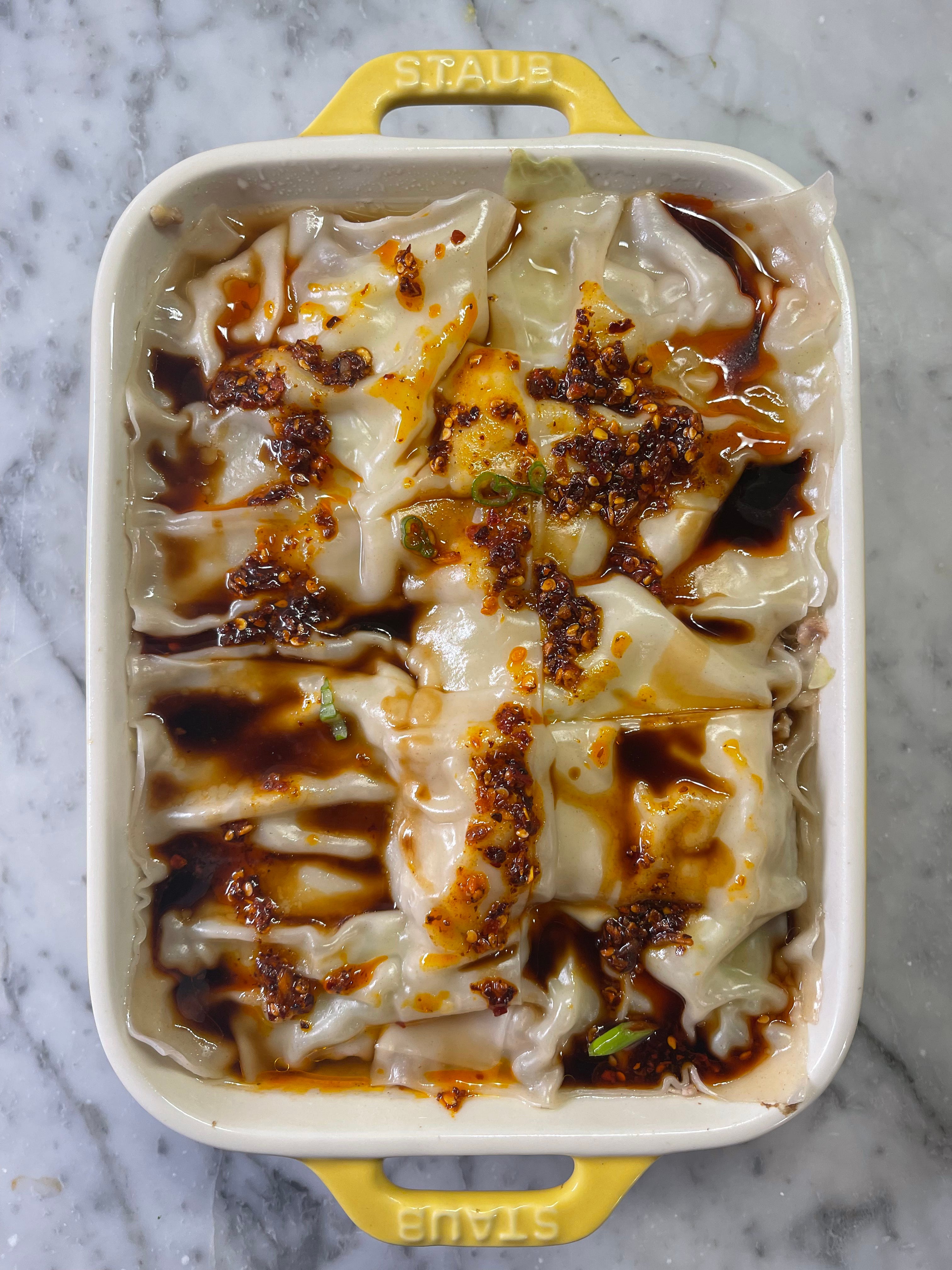 🥟 Make: Soup Dumpling Lasagna. I got TikTok’d and fell down the viral “Soup Dumpling Lasagna” black hole and couldn’t get out. I love, love dumplings and crave them all the time. This technique is honestly brilliant. You take a pound of pork and season with with soy, sesame oil, mirin, garlic, fresh ginger and salt and layer it between cabbage leaves and wonton wrappers and repeat. You then steam it for about 20 minutes and top it with more soy and some chili crisp. It satiated my craving and I will be making it again. Next time with ground lamb and cumin. The options are endless. I love my Staub for this.